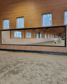 Les miroirs de manège et de carrière HEGA sont fabriqués selon un procédé unique qui utilise un verre en cristal très résistant aux impacts et qui offre un rendu de l’image net, sans déformation.